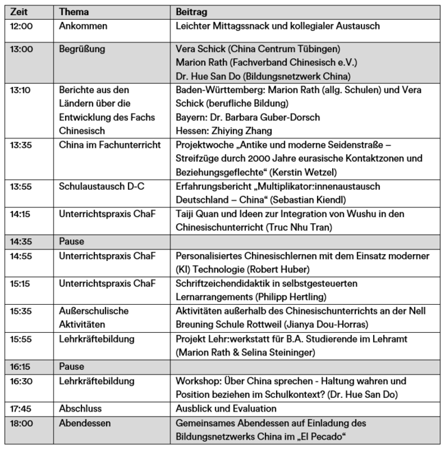 Dieses Treffen ist für den kollegialen und fachlichen Erfahrungsaustausch von Lehrkräften gedacht, die Chinesisch unterrichten und/oder chinabezogene Aktivitäten an Schulen, in der Erwachsenenbildung und an Hochschulen durchführen. Kolleg:innen, die eine China-/Chinesisch-AG unterrichten oder im deutsch-chinesischen Schulaustausch aktiv sind, Referendar:innen und Studierende sowie Lehrkräfte aus anderen Regionen Deutschlands sind ebenso herzlich willkommen.