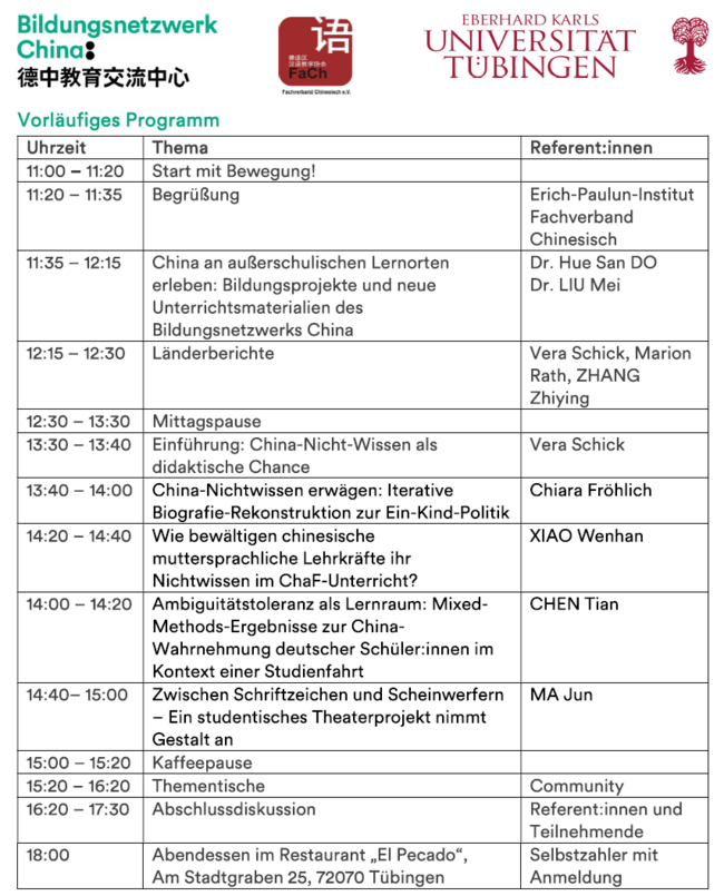 Das Erich-Paulun-Institut der Universität Tübingen, das Bildungsnetzwerk China und der Fachverband Chinesisch laden Sie ganz herzlich zum 3. Süddeutschen Chinesischlehrkräftetreffen nach Tübingen ein. Das Treffen richtet sich an Lehrkräfte, die Chinesisch unterrichten und/oder chinabezogene Aktivitäten wie China-AGs, Schulpartnerschaften an allgemeinbildenden Schulen, in der Erwachsenenbildung und an Hochschulen durchführen, sowie an Referendar:innen, Studierende und Lehrkräfte aus anderen Regionen Deutschlands.