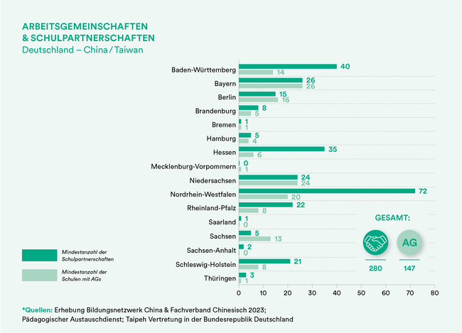 Zahlenmäßig werden AGs in den Ländern des Bundes nicht erfasst. Eine qualitative Untersuchung ergab jedoch, dass die Angebote dort, wo sie in den Schulkontext eingebettet sind und Unterstützung durch die Schulleitung erfahren, oft auf gutem Niveau verstetigt sind. Dabei gibt es eine Bandbreite von Modellen: Chinesisch- AGs zur Sprachvermittlung werden teilweise als Zertifikatskurse angeboten. Gibt es an der Schule bereits Chinesisch-Unterricht, ermöglichen sie gewissermaßen einen Einstieg auf Probe. China-AGs hingegen dienen häufig der Vorbereitung und Begleitung von Schulaustauschen. Darüber hinaus existieren Ansätze, die sich vor allem der umfassenden soziokulturellen Wissensvermittlung widmen oder auch speziellen Themen wie z. B. chinesischen Kampfsportarten. So fördern AGs unterschiedliche chinabezogene Teilkompetenzen etwa in den Bereichen Sprache oder interkulturelle Handlungskompetenz. Für viele AGs liegt neben der Finanzierung und dem Lehrkräftemangel die Herausforderung darin, nicht nur bei den Schüler:innen, sondern auch im Schulumfeld Interesse zu wecken, Bedarfe zu erkennen, Beziehungen aufzubauen und die gesellschaftliche Relevanz der Beschäftigung mit China und dem chinesischen Sprach- und Kulturraum zu vermitteln. Gelingt dies, können AGs Beständigkeit als Einstiegsangebote in die China-Kompetenz erreichen.