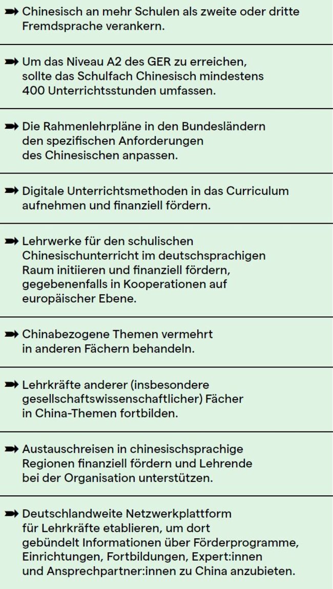 Expert:innen, die mittels fundierter Sprachkenntnisse und Landeserfahrungen ein differenziertes Bild von China in der Öffentlichkeit zeichnen können, sind in Deutschland rar. Um China besser einschätzen zu können, benötigen wir mehr Chinesischkenntnisse und mehr Chinawissen in der breiten Masse. Und diese Wissensvermittlung beginnt in den Schulen.