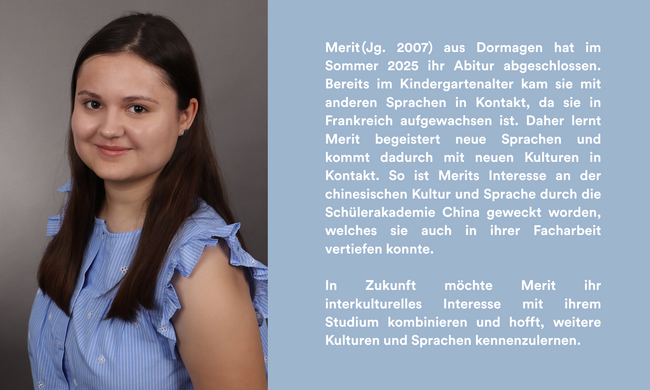 In der Akademie habe ich den Kurs C2 Chinabilder belegt, in welchem wir uns mit Vorurteilen gegenüber China befasst haben. Diese haben wir wissenschaftlich betrachtet und im Anschluss widerlegt, belegt oder eingeschränkt. In diesem Kontext konnte ich viele neue Informationen in Bereichen, wie dem chinesischen Schulsystem, der Geografie, dem politischen System und der Geschichte Chinas erhalten. Daher war eines meiner Highlights die Videokonferenz nach China, in welcher wir uns mit chinesischen Schülern in unserem Alter über unsere Kulturen austauschen konnten.